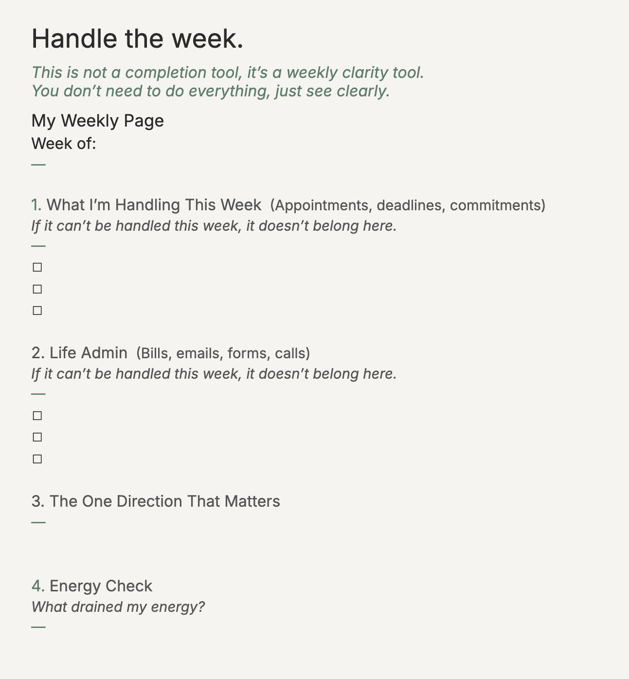 No pressure to “do it right.”If something can’t be handled this week, it doesn’t belong here.