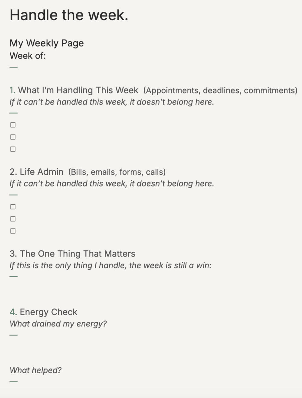 No pressure to “do it right.”If something can’t be handled this week, it doesn’t belong here.